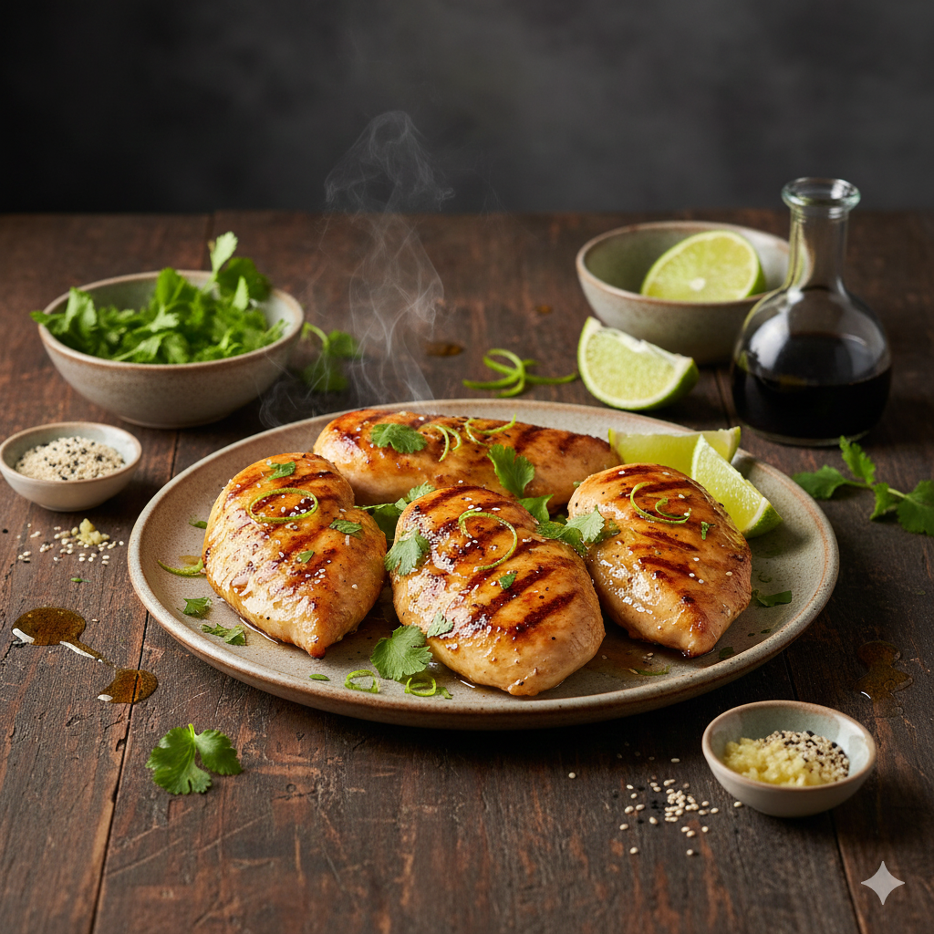 • In einer Schüssel die Hähnchenbrustfilets mit Olivenöl, Limettensaft, geriebener Limettenschale, gehacktem Koriander, Knoblauch, Ingwer, Sojasauce und Honig vermengen. Mit Salz und Pfeffer abschmecken.